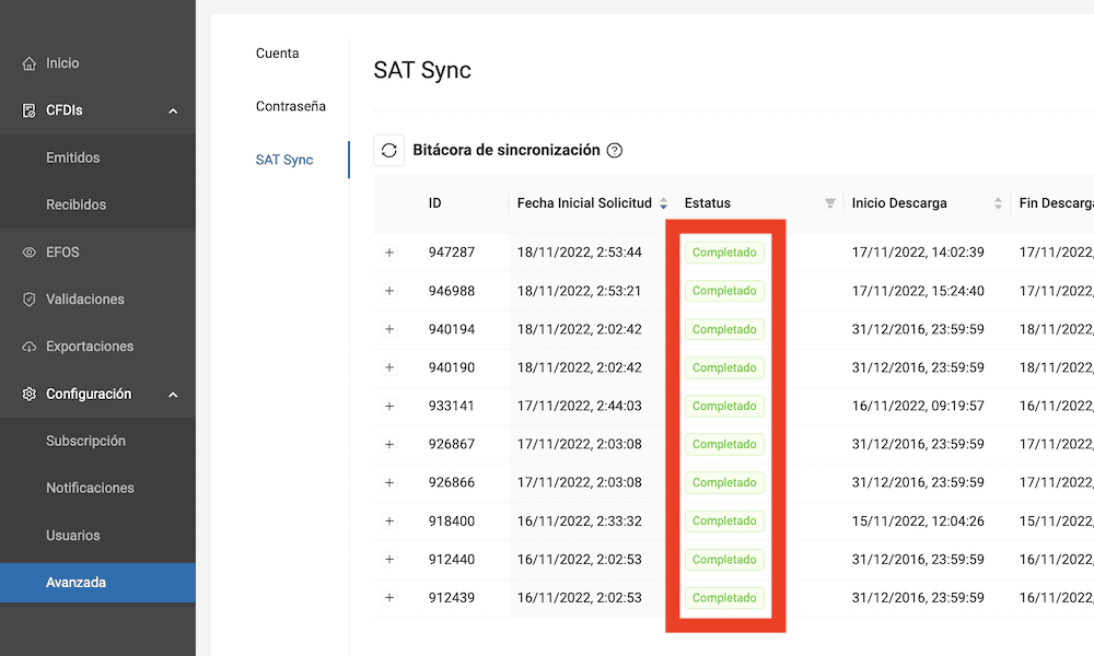 Al crear la empresa se sincroniza con el web service del SAT descarga CFDIs y Metadata tanto emitidos como recibidos automáticamente desde el 2013 en 24 horas aproximadamente, una vez descargada toda la información histórica realiza la descarga de cada día permitiendo tener en tiempo real toda la información que tiene el SAT de tu empresa.