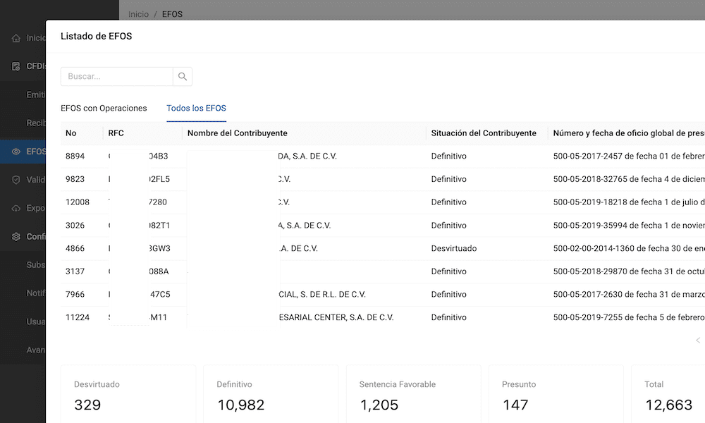- Revisión y alertas automáticas para operaciones con EFOS (Empresas que facturan operaciones simuladas).