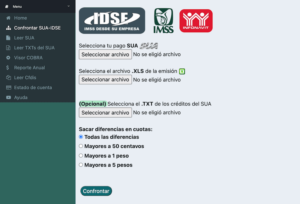 Permite obtener las diferencias en cuotas obrero patronal, días cotizados, nombres, números de créditos, empleados faltantes en SUA/IDSE. Exporta todas las diferencias a un archivo Excel para poder manipular las diferencias al gusto del usuario.