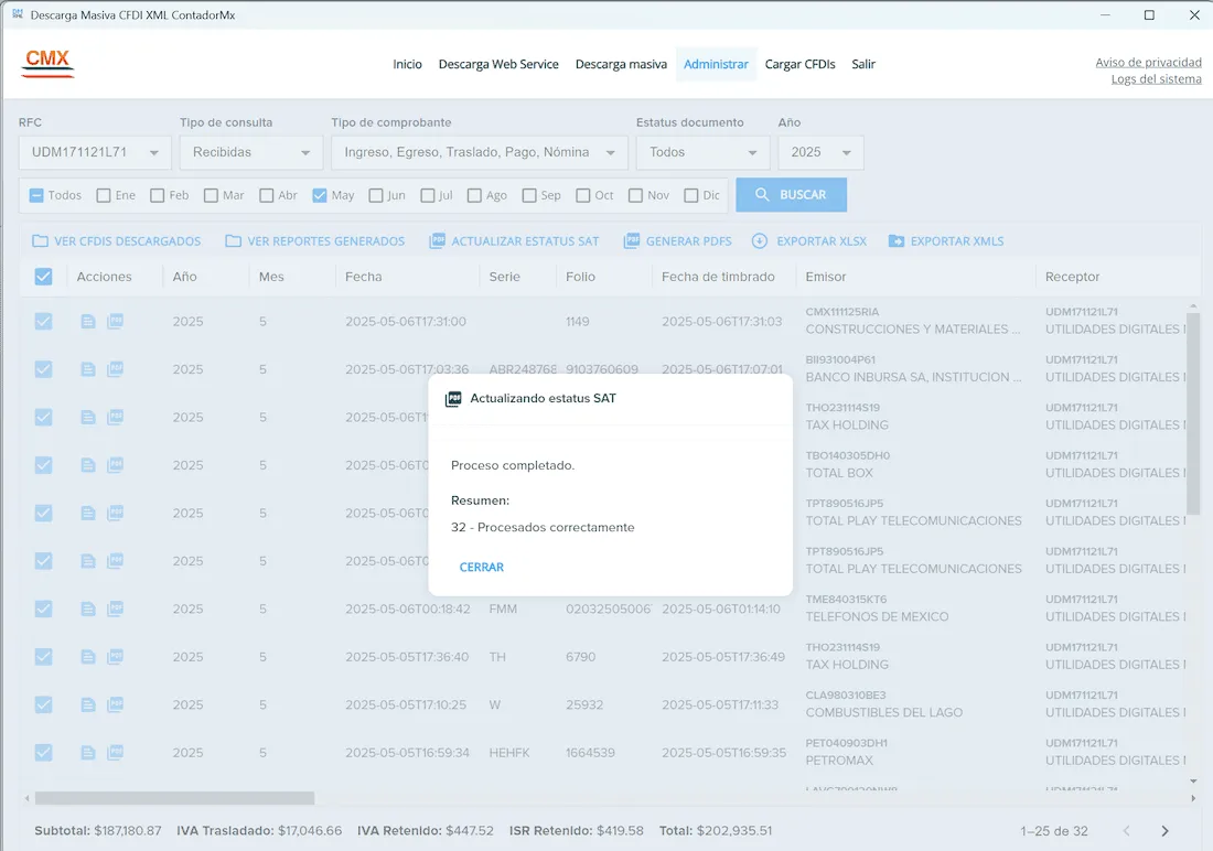 Realiza solicitudes masivas al WebService del SAT, descargando hasta 200,000 XML en una sola petición, lo que agiliza significativamente el proceso de gestión documental.