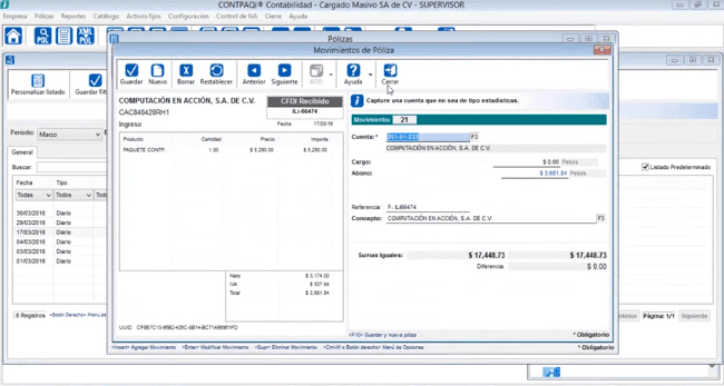 - Cumple con todos los requisitos de la Contabilidad Electrónica asociando los UUID a cada movimiento de la póliza.